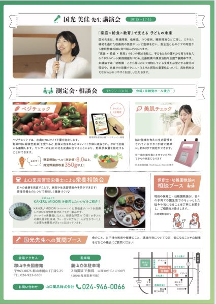 「家庭×給食×教育」の3つの視点を柱に、子どもたちの健やかな育ちを支える講座の開催など、全国で出張授業や講演会を展開している国光美佳先生の講演の他、ベジチェックや美肌チェック等の測定、管理栄養士による栄養相談や保育士・幼稚園教諭による相談ブースの設置などを予定しています。