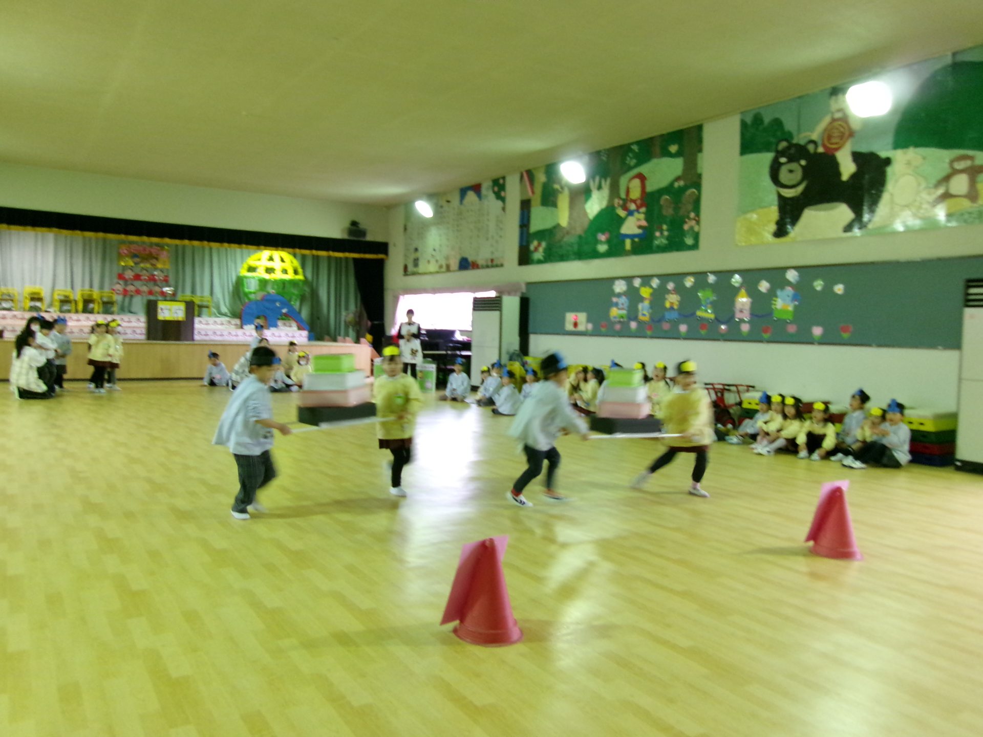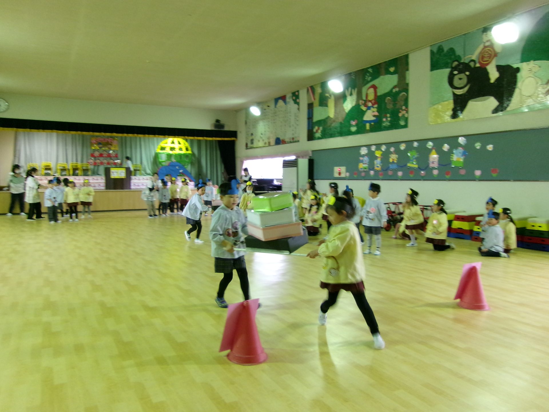 年長さんは体育館に集まり、ひなまつりの由来を聞いた後、ひしもち運びリレーを行いました。