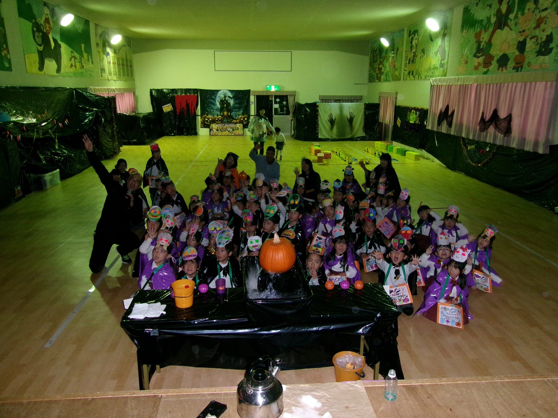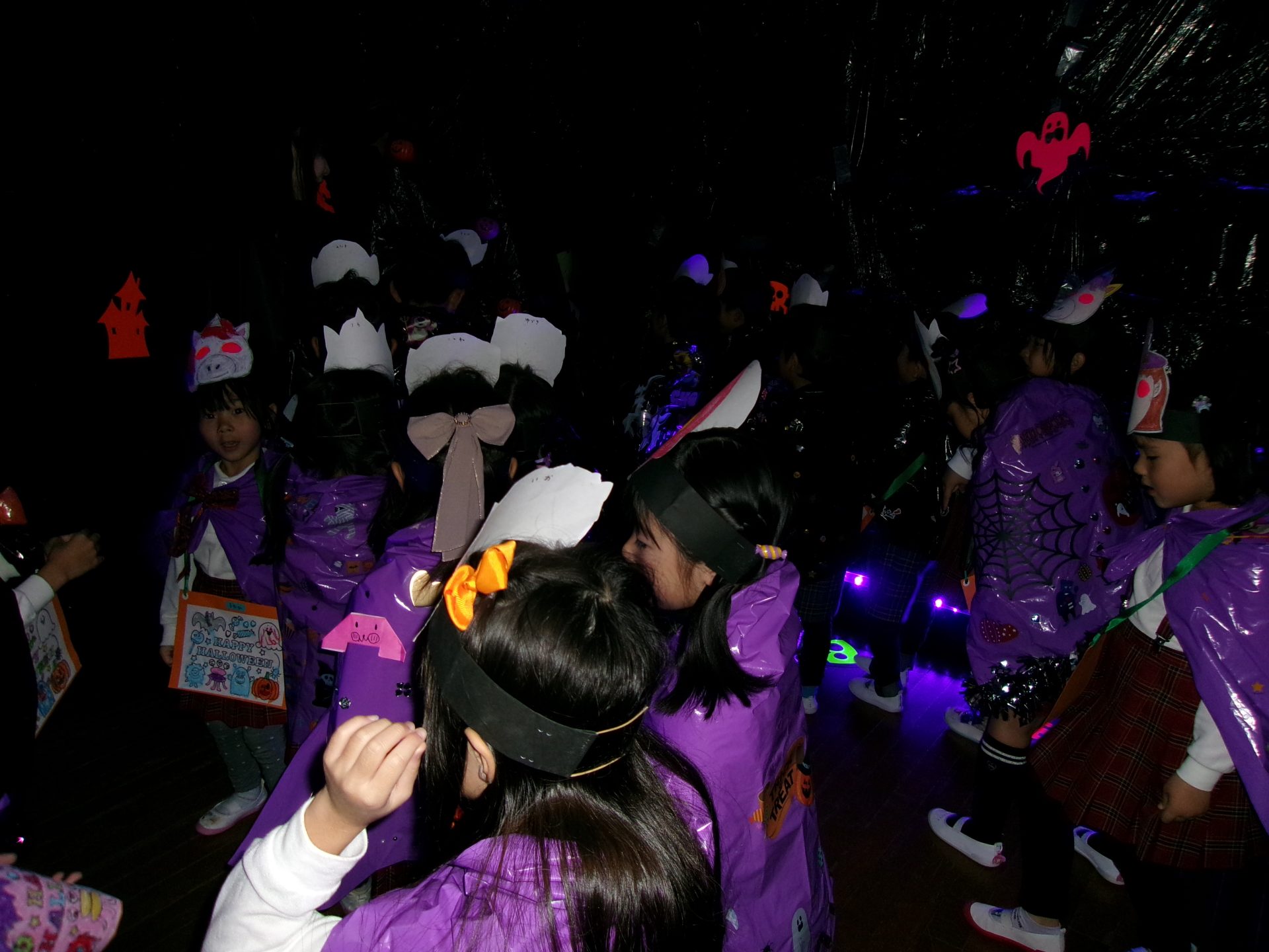 年長さんは、体育館で「パンプキンカービング」や「キャンディートス」を楽しんだり、ブラックライトルームで不思議体験をしたりと、楽しく、ちょっぴり怖い(?)怖いハロウィンパーティを体験しました。