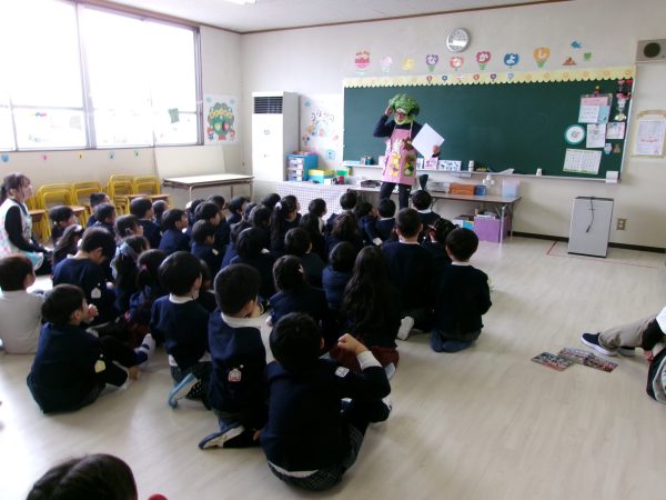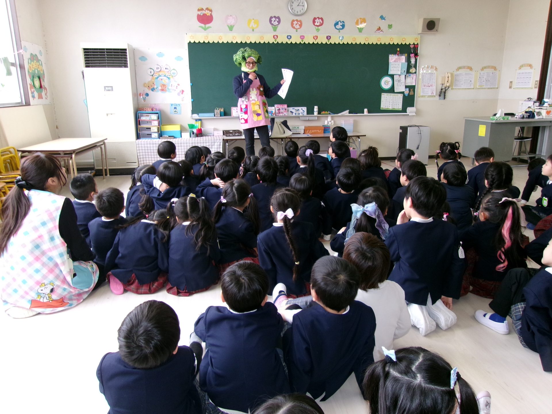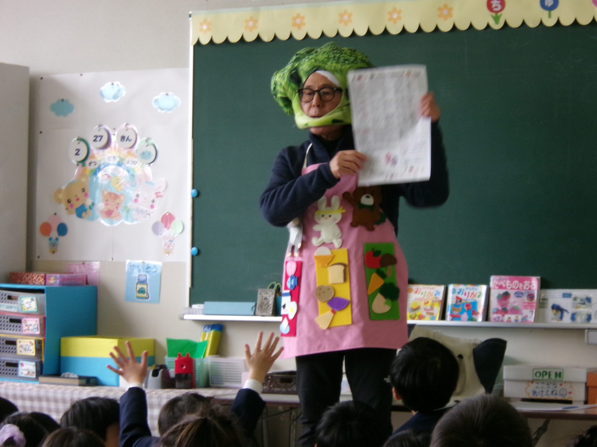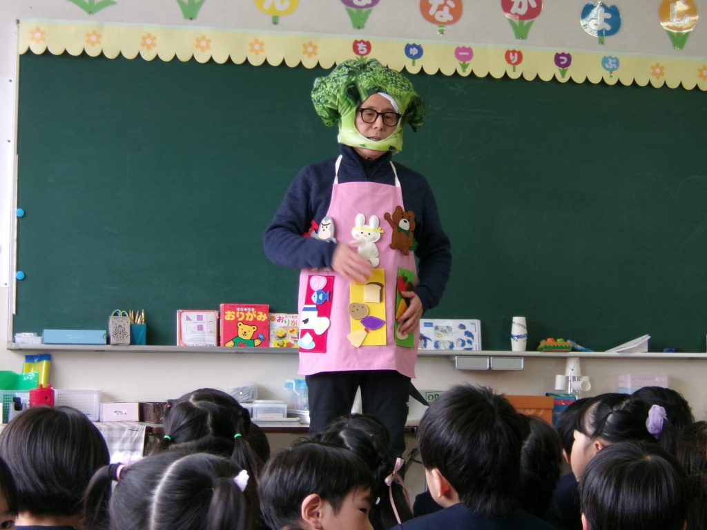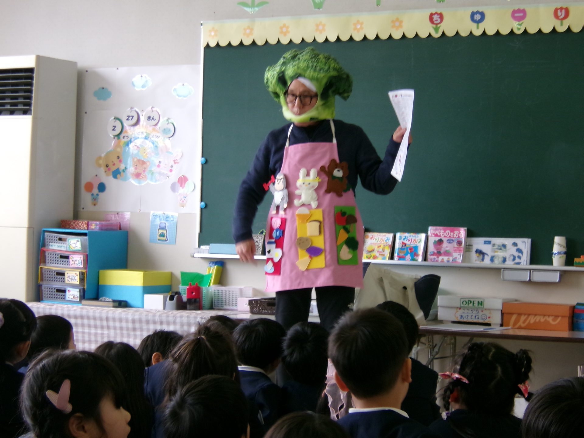 園長が年長の子どもたちに食に関するエプロンシアターを行いました。ブロッコリーマンに変身し、「赤」:ゴリラさんのように大きく力が強くなる食べ物グループ、「黄」:うさぎさんのように足が速く元気に遊べるようになる食べ物グループ、「緑」:くまさんのようにけがや病気をしなくなるような食べ物グループに仲間分けしました。
