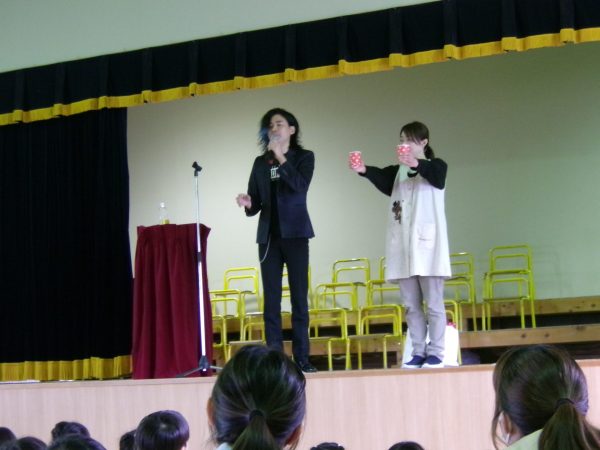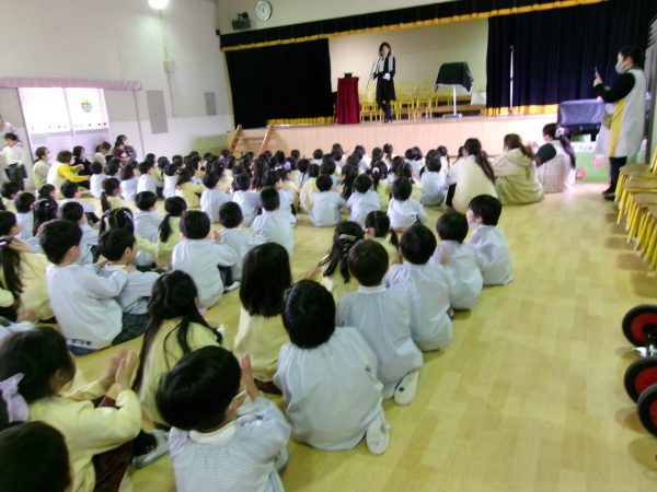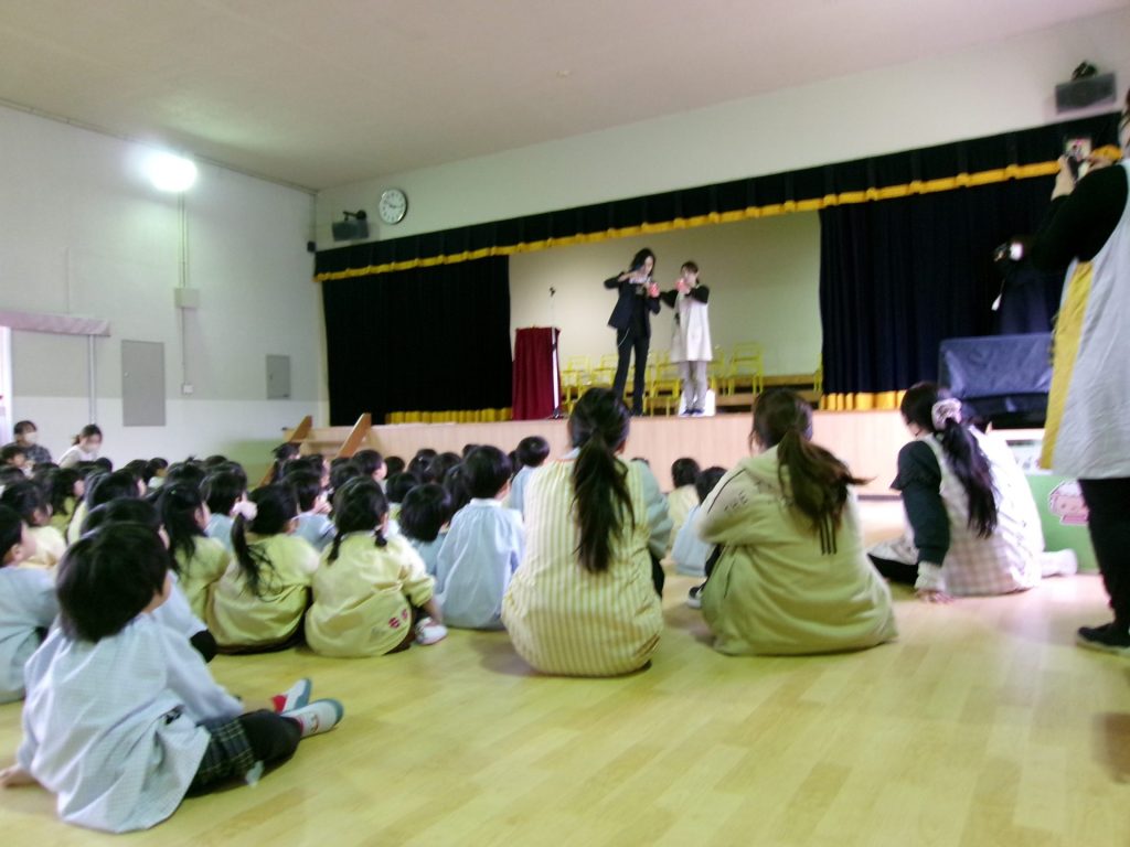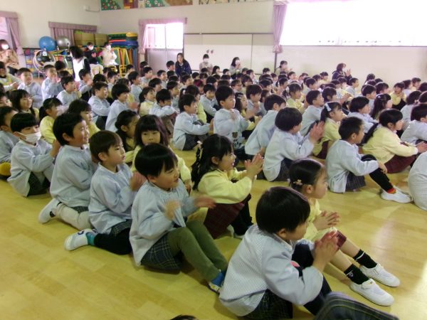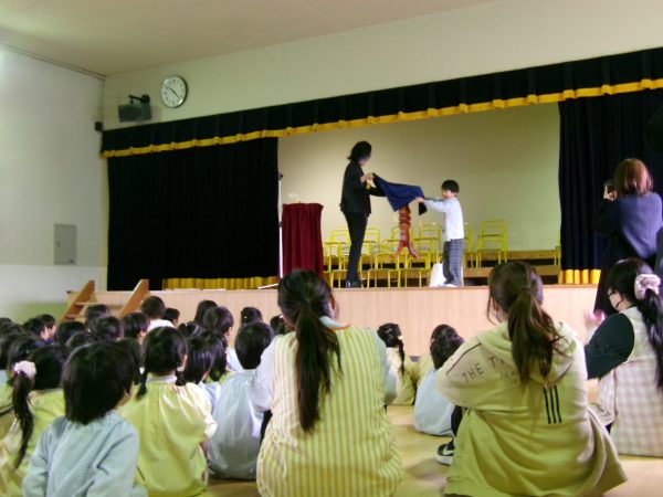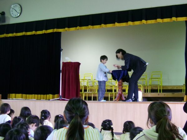 鳩が現れては消え、先生の頭の上のコップにあった水がなくなり・・・不思議なマジックに子どもたちは大興奮。