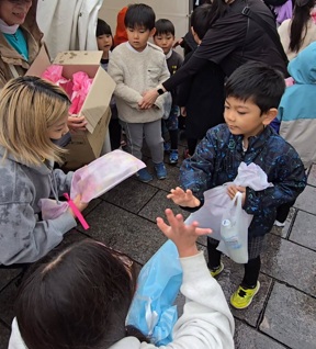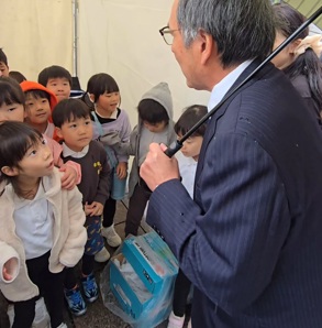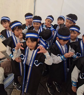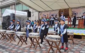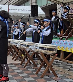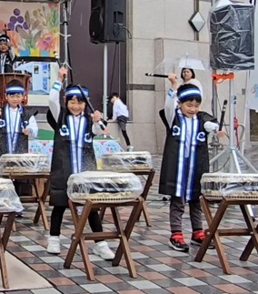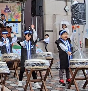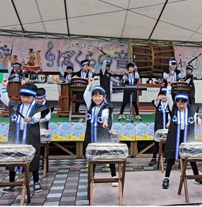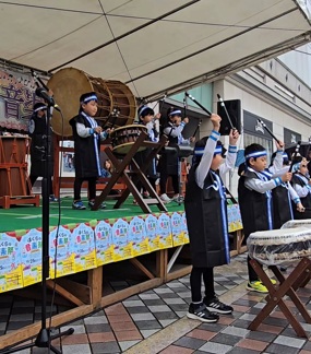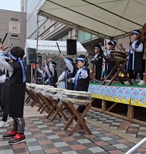 25日(土)に中町ゆめ通り、うすい百貨店前で行われた「ぼくらの音楽祭」で年長日本太鼓隊の子どもたちがそのオープニングを飾りました。